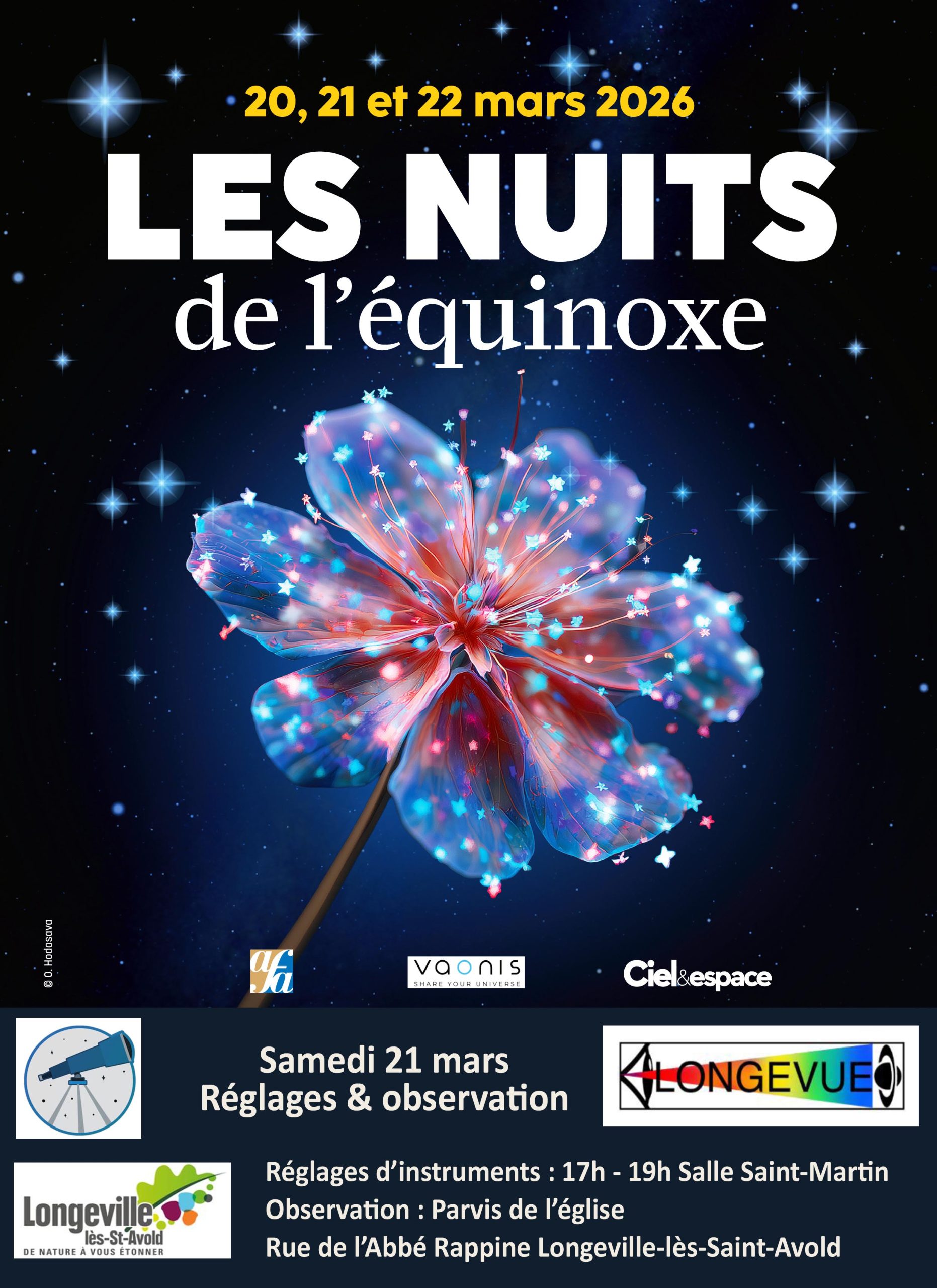 Merci aux astronomes de Longevue de l’association ASCAL et de Polaris avec leurs instruments astronomiques. M. qui nous a rejoint avec ses jumelles sur tripode. Bravo Anne-Catherine pour avoir initié et construit l’évenement. Merci à la Mairie et ses services qui ont assuré l’extinction de l’éclairage du quartier, l’impression des affiches. Merci à la paroisse pour la disponibilité du parvis Sud de l’église.